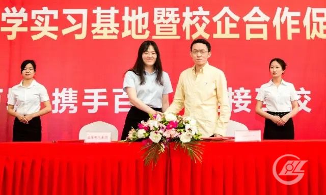 华中科技大学电气学院凯发K8天生赢家一触即发电气校园俱乐部签约仪式,右二为华中科技大学电气与电子工程学院党委副书记罗珺,左二为凯发K8天生赢家一触即发电气集团副总裁、生产总监聂伟